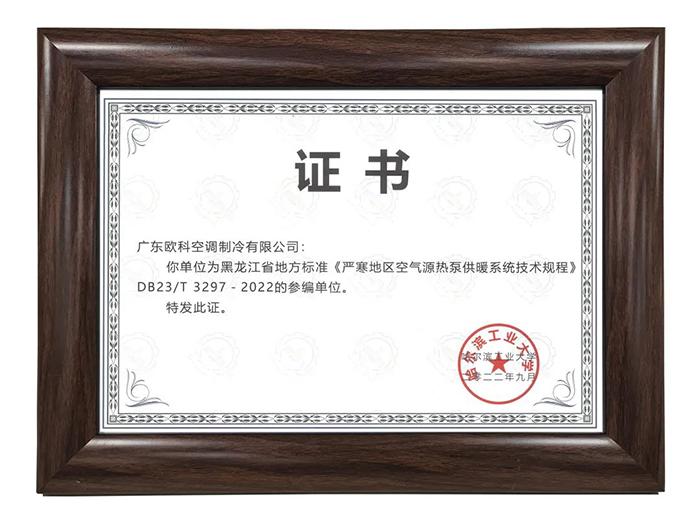 近日,經黑龍江省住房和城鄉建設廳和黑龍江省市場監督管理局批準,由哈爾濱工業大學主編的黑龍江省地方標準《嚴寒地區空氣源熱泵供暖系統技術規程》正式發布并實施。廣東歐科空調制冷有限公司(簡稱:EK空調)作為參編單位,參與了該標準的制定。