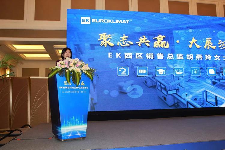 會(huì)議開始,EK空調(diào)華西區(qū)區(qū)總胡燕玲首先致辭,她向在場(chǎng)嘉賓介紹了疫情三年來(lái)EK空調(diào)在四川以及整個(gè)華西地區(qū)的業(yè)績(jī)?cè)鲩L(zhǎng)情況,并感謝各位經(jīng)銷商長(zhǎng)期以來(lái)的支持。希望在2023年,大家可以把握市場(chǎng)機(jī)遇,一起再創(chuàng)佳績(jī)。胡燕玲強(qiáng)調(diào):商家賺到錢,我們才有市場(chǎng)。