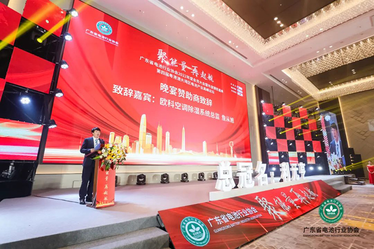 在由【EK轉(zhuǎn)輪除濕贊助】的晚宴及頒獎盛典上,EK除濕系統(tǒng)總監(jiān)詹從旭上臺致辭,他表示:EK在工業(yè)環(huán)境的溫度控制、濕度控制、潔凈控制方面做了大量的研發(fā)工作,為全球上萬個用戶提供了高質(zhì)量的產(chǎn)品和服務(wù)。EK今天帶來的ADR-DRY一體化高效轉(zhuǎn)輪除濕機 X2.0系列產(chǎn)品將進一步提升EK除濕系統(tǒng)的節(jié)能效果,并確保轉(zhuǎn)輪除濕產(chǎn)品的運行可靠性,為電池客戶提供一個高標(biāo)準(zhǔn)、低能耗的濕度環(huán)境。在全球電動化浪潮和節(jié)能減排共識下,EK愿意和廣東省電池行業(yè)協(xié)會及所有會員單位一起完成低碳減排賦予我們的時代使命。