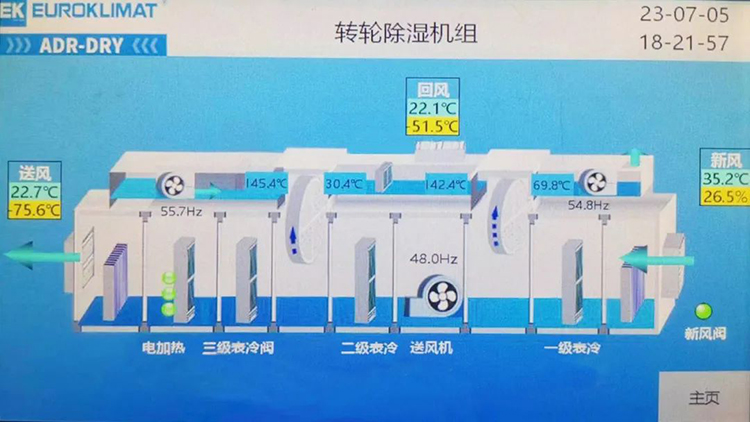 該機組適用于低露點的工藝要求,室內(nèi)露點最低可達-80℃,節(jié)能率達40%以上,可應用于電芯烘烤、注液、封口等電池生產(chǎn)車間的多個工藝環(huán)節(jié)。