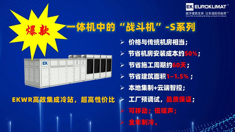 此次會議,EK首次推出了號稱一體機中的“戰(zhàn)斗機”——S系列云智慧高效集成冷站,該系列集成冷站最大的優(yōu)勢就是采用EK自制冷卻塔,超高性價比,價格與傳統(tǒng)機房的造價相當,安裝成本節(jié)省約50%,且冷卻塔與主機段采用一體化設計,是真正意義上的一體機。