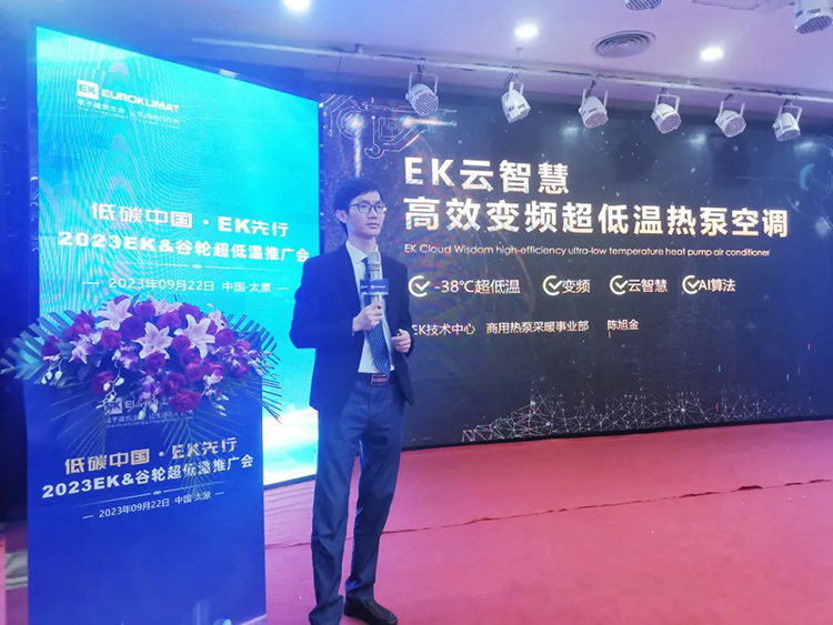 推廣會現(xiàn)場,EK空調商用熱泵采暖事業(yè)部產(chǎn)品經(jīng)理陳旭金和現(xiàn)場嘉賓介紹了EK超低溫熱泵的發(fā)展歷史、產(chǎn)品陣容、系統(tǒng)優(yōu)勢以及在嚴寒地區(qū)各行業(yè)的應用案例。