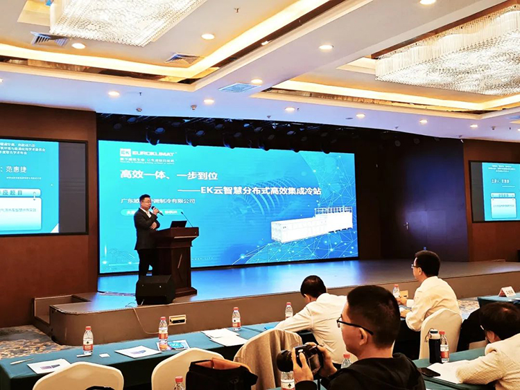年會(huì)現(xiàn)場(chǎng),EK空調(diào)大型冷水機(jī)事業(yè)部徐楓林以《高效一體、一步到位——EK云智慧分布式高效集成冷站》為題發(fā)表演講,和現(xiàn)場(chǎng)嘉賓重點(diǎn)介紹了EK高效機(jī)房系統(tǒng)核心產(chǎn)品——云智慧分布式高效集成冷站的組成、特點(diǎn)、優(yōu)勢(shì)、應(yīng)用場(chǎng)景和項(xiàng)目案例。