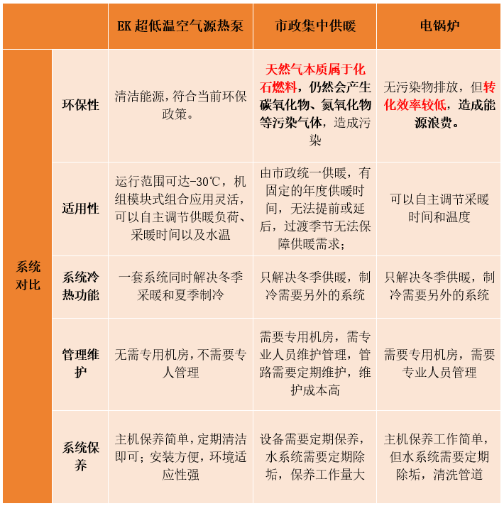 以目前在我國北方寒冷地區幾種常見的采暖方式對比,EKAH系列超低溫空氣源熱泵機組采用EVI噴氣增焓技術,節能率較高,受環境因素影響小,系統運行穩定,適合長期供暖。