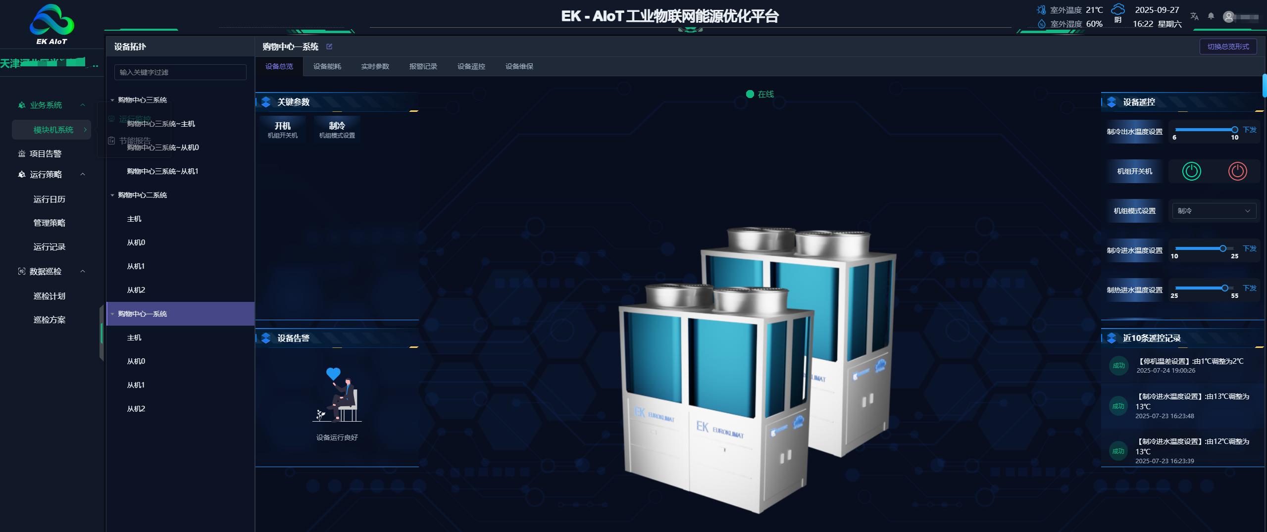 針對商業購物中心既要滿足夏季制冷,又要保障冬季制熱的需求,EK空調為項目定制以 “11臺全變頻超低溫空氣源熱泵機組” 為核心設備,搭配“AIoT 智慧云控系統” 的整體解決方案,從設備性能到智能管理,精準破解商業場景難題。
