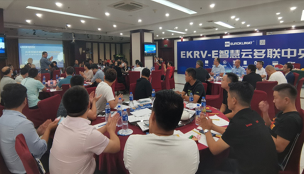 EK多聯機銷售總監張旭東,天津多聯機總經理陳鋒、產品工程師韓曉彬代表EK出席此次會議。會上進行了EK品牌歷程、核心技術、全系列產品的分享,并重點介紹了EK智慧云多聯機-30℃穩定制熱技術、差異化賣點、云服務等。