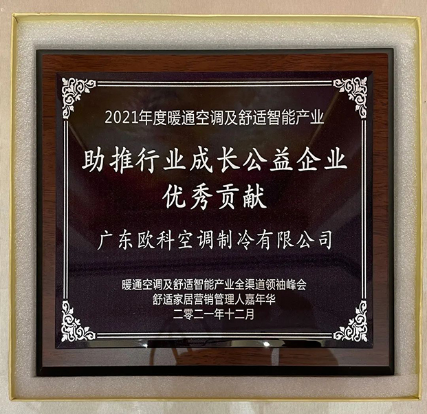 在2021年度暖通空調及舒適智能產業品牌企業榮譽榜單發布環節中,廣東歐科空調制冷有限公司榮獲“助推行業成長公益企業優秀貢獻”稱號。